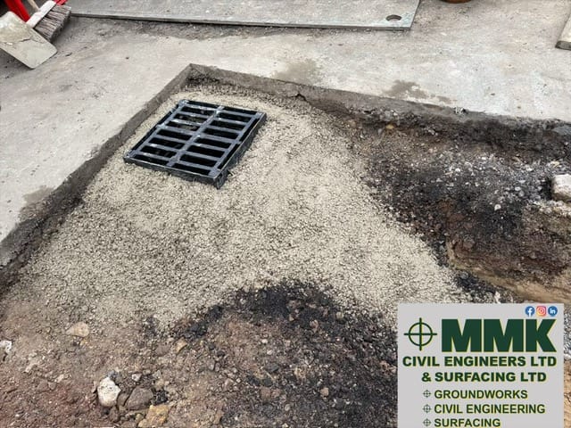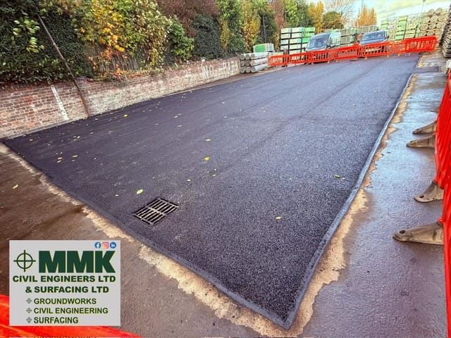 We removed circa 400m2 of the existing surfacing and disposed off site. Then we installed new surface water drainage which consisted of a new 150mm diameter pipeline, and 3 no new road gullies, and a connection to an existing manhole / chamber. New granular sub base and compaction, and new machine laid asphalt / tarmac binder and surface courses, the surface course being a hard wearing SMA surface course.